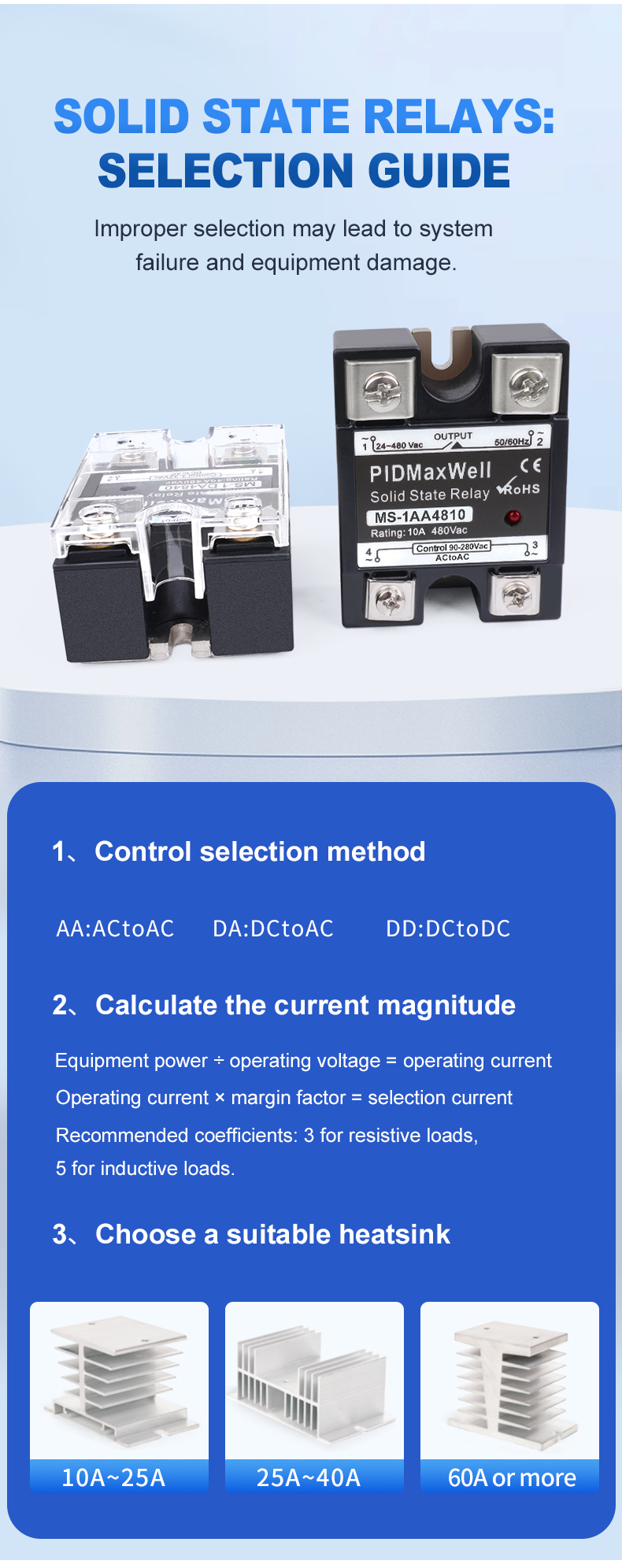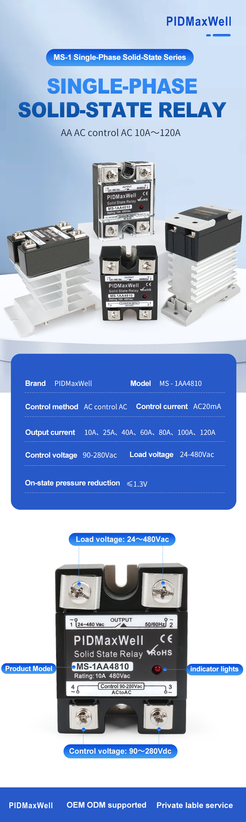 | Ampla faixa de tensão | Entrada de controle de 90–280 VCA e tensão de carga de 24–480 VCA, compatível com sistemas de 110 V/220 V/380 V/480 V. |