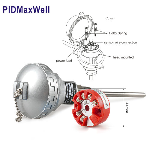 Transmissor de temperatura para montagem na cabeça É um dispositivo instalado diretamente na cabeça de conexão de um sensor de temperatura, geralmente um termopar ou um RTD. A principal função do transmissor de temperatura é converter o sinal bruto e fraco do sensor em um sinal analógico, como 4-20 mA. O transmissor possui diversas opções, como o tipo isolado. Versão Hart, Versão compatível com Modbus RS-485. Abaixo, uma imagem mostra sua aparência e como é instalada dentro do conector.