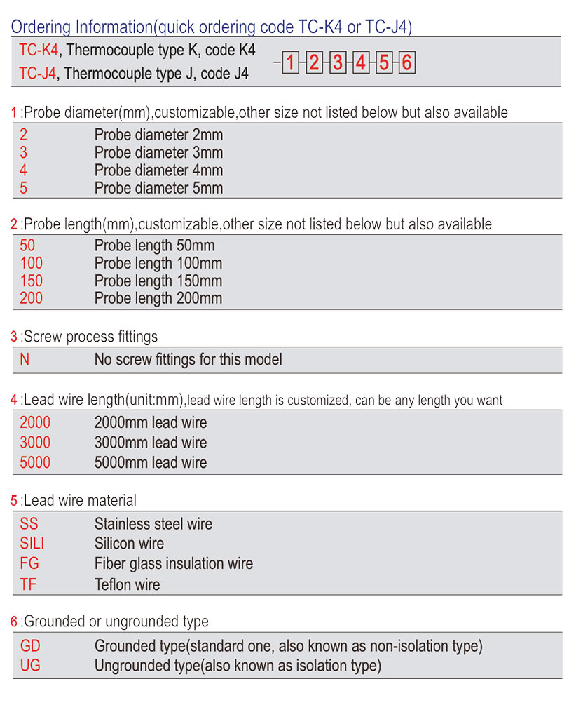 | TC-T4-3-50-N-2000-SS-GD | Termopar tipo T, sonda de Ø3 mm, comprimento de inserção de 50 mm, sem conexões, fio condutor de aço inoxidável de 2000 mm, junção aterrada. |