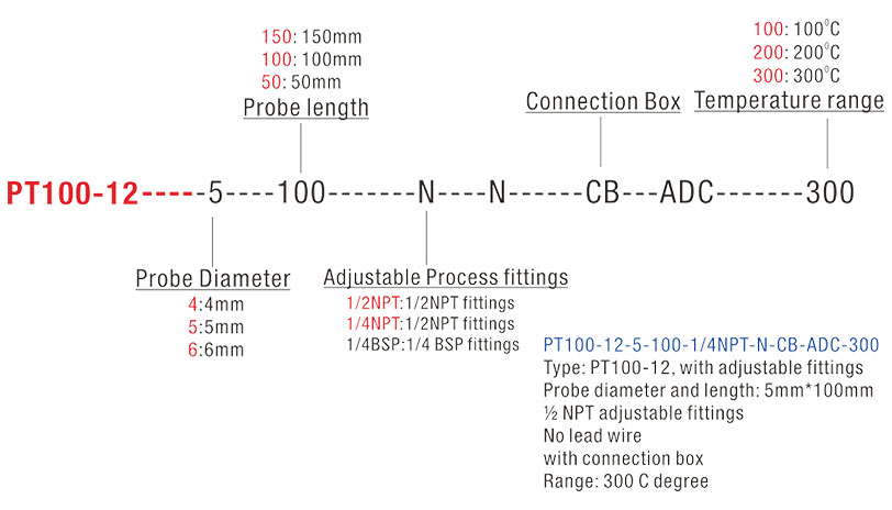 PT100-12 — [Diâmetro da Sonda] — [Comprimento da Sonda] — [Conexão de Processo Ajustável] — [Fio Condutor] — [Caixa de Conexão] — [Faixa de Temperatura]