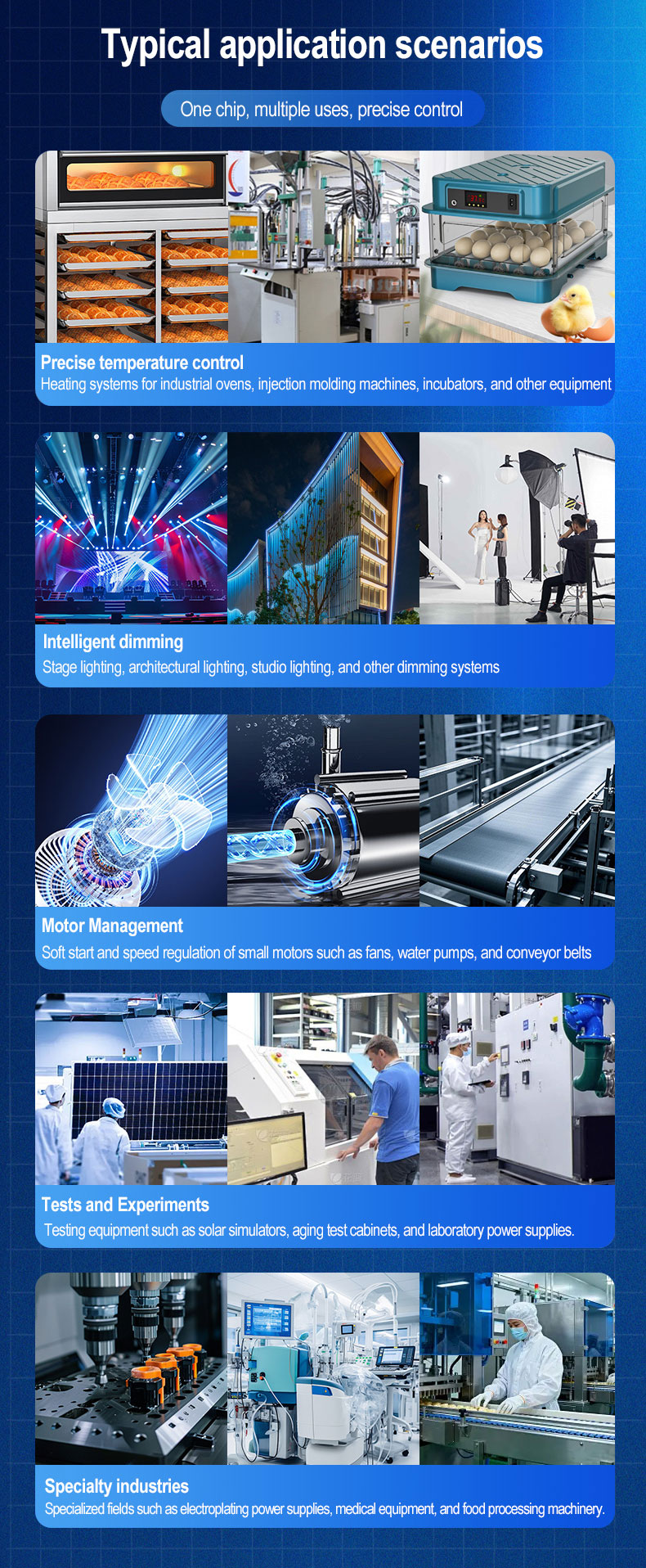 Altamente eficaz para controlar tanto elementos de aquecimento resistivo (fornos, estufas) quanto cargas indutivas (motores, transformadores, ventiladores). |
