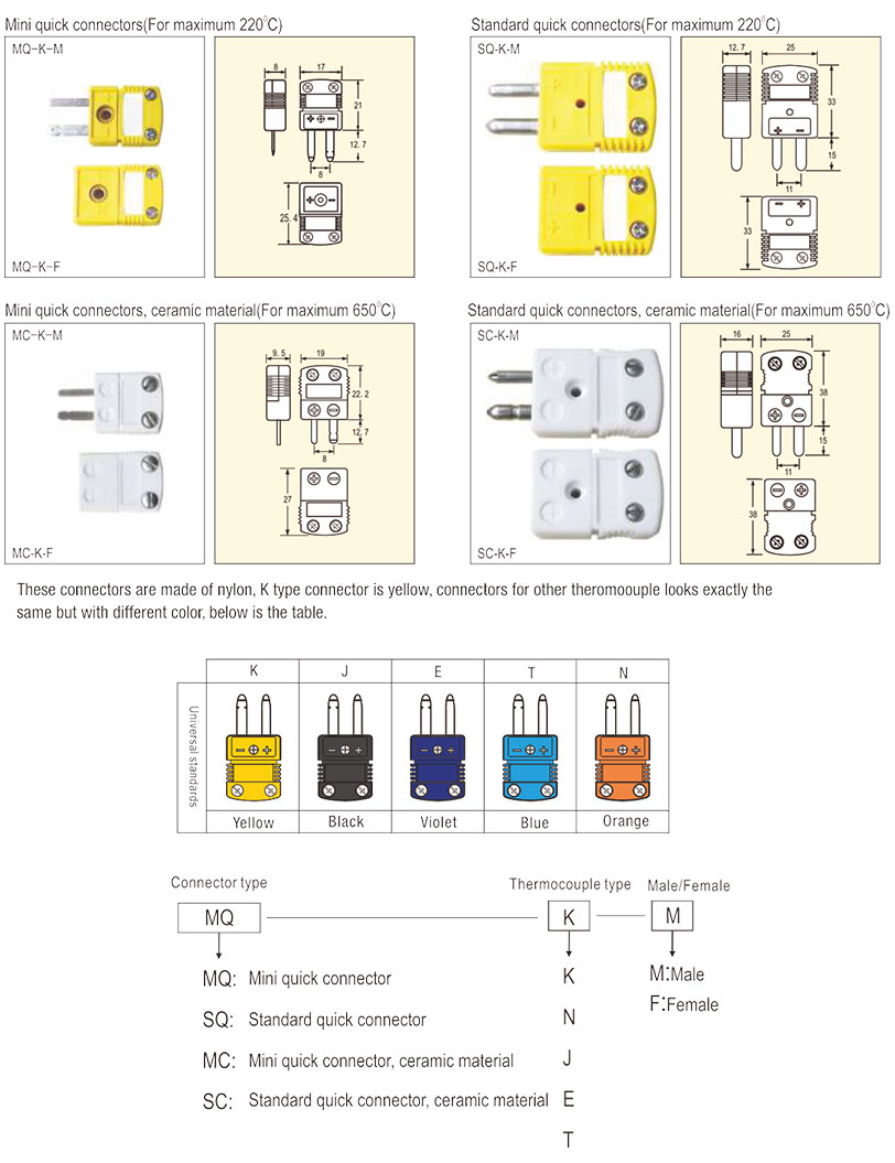 Mini conector rápido, corpo em nylon (máx. 220 °C) Conector rápido padrão, corpo em nylon (máx. 220 °C) Conector rápido mini, corpo em cerâmica (máx. 650 °C) Conector rápido padrão, corpo em cerâmica (máx. 650 °C) |
