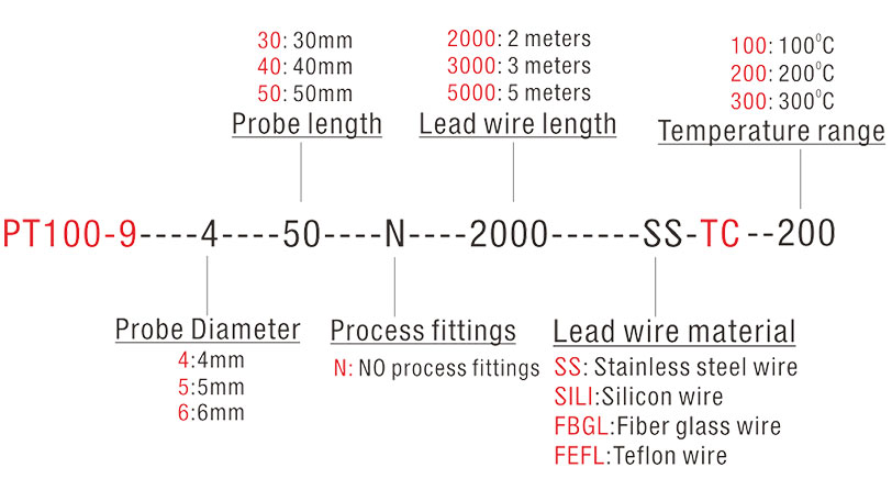 PT100-9 — [Diâmetro da Sonda] — [Comprimento da Sonda] — [Conexão de Processo] — [Comprimento do Fio Condutor] — [Material do Fio Condutor]-TC — [Faixa de Temperatura]